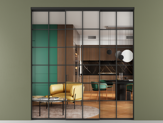 Алюминиевые перегородки имеют единый профиль с алюминиевыми дверьми и легко сочетаются в одном пространстве, не перегружая его. Также их можно комбинировать в интерьере с полотнами из нашего стандартного ассортимента. Помимо этого, система алюминиевых перегородок и дверей координируется со стеновыми панелями Волховец.