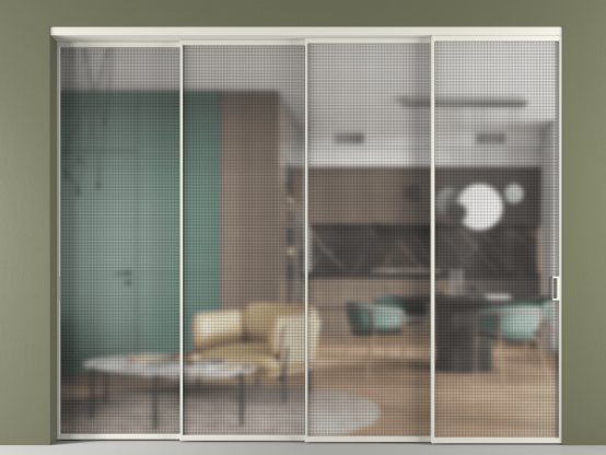 Во всех алюминиевых перегородках, независимо от типа установки, используется компланарный раздвижной механизм, благодаря которому декоративная крышка и полотно находятся в одной плоскости.