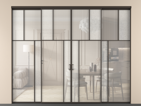 Во всех алюминиевых перегородках, независимо от типа установки, используется компланарный раздвижной механизм, благодаря которому декоративная крышка и полотно находятся в одной плоскости.
