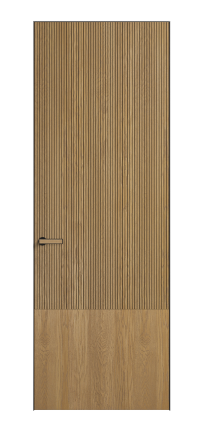 Это полотна с рельефной фрезеровкой. Этот прием делает интерьер объемным, тактильным, вносит интересную текстуру и создает современный образ. Волнистый рельеф может быть выполнен по ламелям из массива дуба в древесных матовых отделках, либо исполнен по натуральному и экологически безопасному материалу — ХДФ, покрытому гладкой эмалью актуальных оттенков.